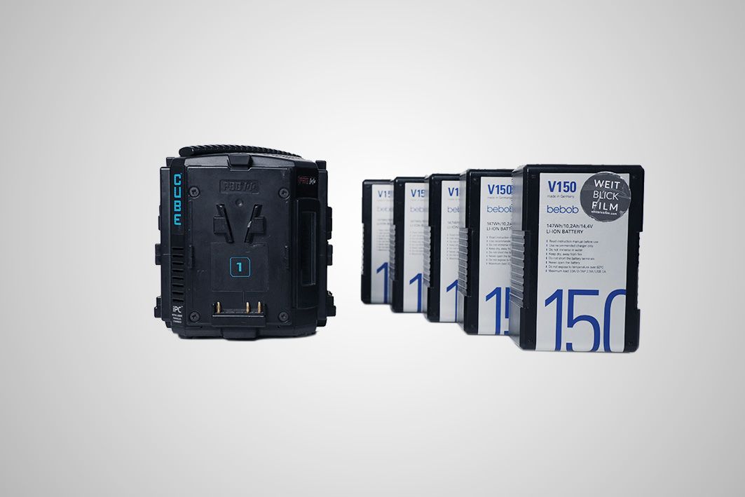 4fach V-Mount Charger, ggf. auch einzeln zu Mieten oder im Set mit 4x 150wh Bebob V-Mount